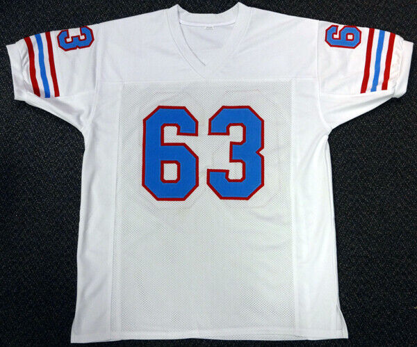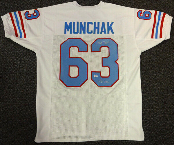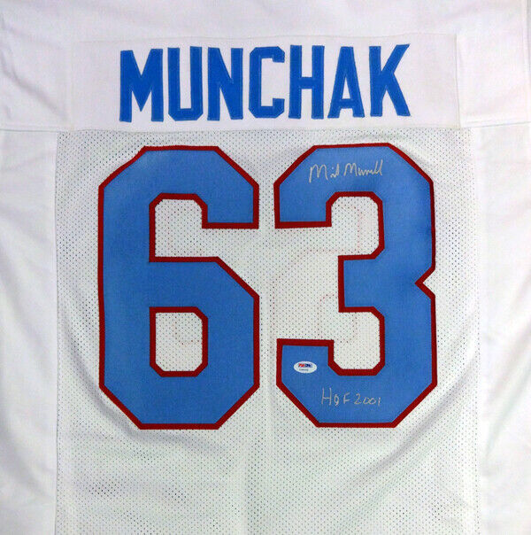 This is a White Custom Jersey that has been hand signed by Mike Munchak. This is a custom jersey with no name brand. The approximate size is XL. It has nice sewn in name and numbers. Along with the autograph, this item also comes with the inscription which reads "HOF 2001". This item has been certified authentic by PSA/DNA and comes with their tamper-proof sticker and matching certificate of authenticity.