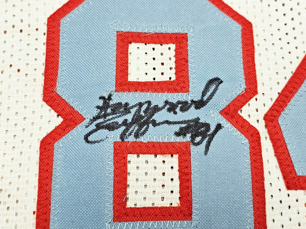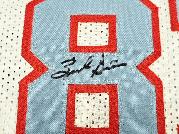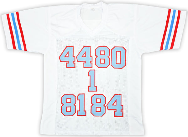 This is a White Jersey that has been hand signed by 5 members of the Houston Oilers Run & Shoot. These members are Warren Moon, Curtis Duncan, Ernest Givins, Haywood Jeffries, and Lorenzo White. This is a custom jersey with no name brand. The approximate size is XL. It has nice sewn in name and numbers. This item has been witnessed and certified authentic by Beckett Authentication (BAS) and comes with their tamper-proof witness sticker.