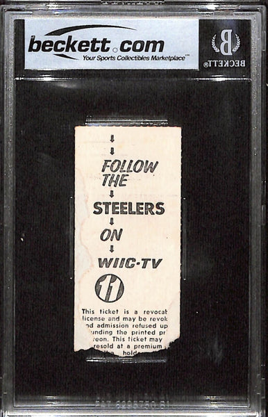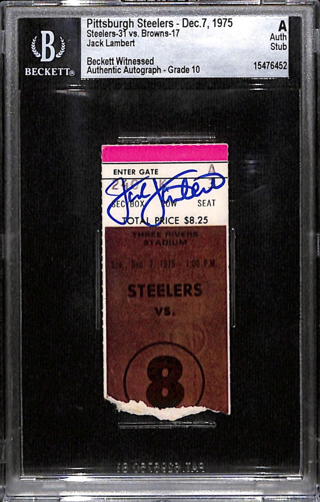 Jack Lambert Signed Pittsburgh Steelers 12/7/75 Ticket Stub Slab Beckett 38404 The number in the listing title is just an inventory sku for our records and is not the authentication number. The item pictured is a stock photo unless otherwise noted. This is a Pittsburgh Steelers 12/07/1975 Slabbed Ticket Stub that was personally autographed by Jack Lambert. Includes a certificate of authenticity from Beckett Authentication Services (BAS) and Denver Autographs.