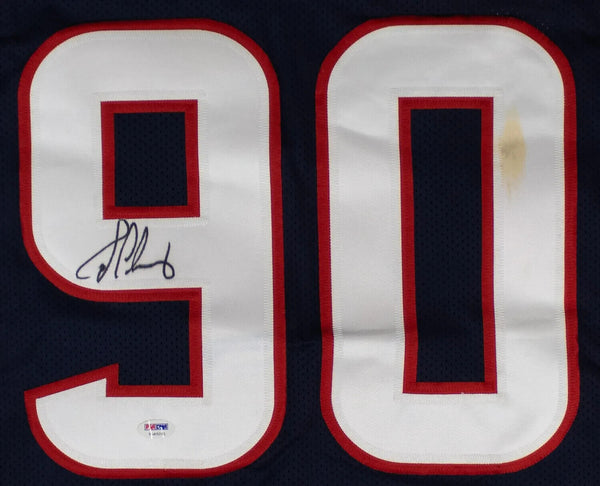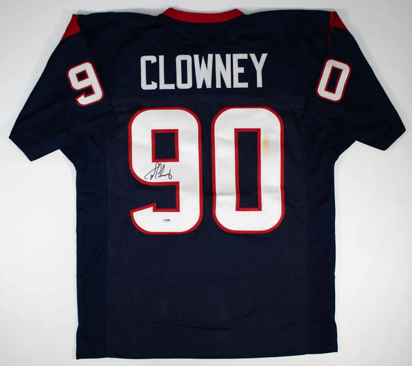 Custom on-field style jersey. Everything is sewn on, size XL. Hand-signed in black felt-tip pen by Jadeveon Clowney of the Houston Texans. Note: There is a stain on the number (see photo).This autograph is certified by PSA/DNA (Professional Sports Authenticators). It comes with the numbered authentication hologram with QR code card which can be verified on the PSA website, psacard.com.Custom on-field style jerseys are a more affordable option for autograph seekers. These jerseys do not have any brand name or tags and are made in the Philippines. They feature stitched on names and numbers and are made to look very similar to the on-field jerseys that the players wear. These custom jerseys are very commonly used in the memorabilia industry.