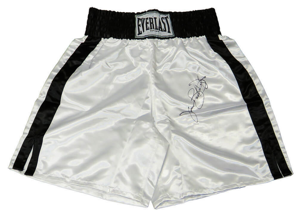 James Buster Douglas signed Everlast white boxing trunks. Item comes with a Schwartz Sports Memorabilia tamper-proof numbered hologram and Certificate of Authenticity which can be verified online.