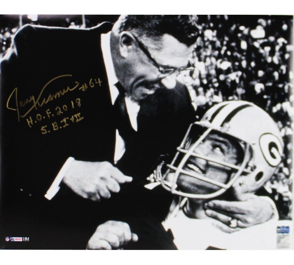 A Green Bay Packers Unframed 16x20 NFL Photo - Lombardi hand signed by Jerry Kramer. The item and signature are in excellent condition. In addition to signing his name, Jerry inscribed "HOF 2018, SB I & II" on the item. Jerry is a 2x Super Bowl Champion, 5x NFL Champion, 3x Pro Bowler, and is in the Green Bay Packers Hall of Fame. AUTHENTICATION: Your item is tagged with a SmarTag powered by Prova Technology, which gives you digital access to your items authentication records, which includes a proof picture from the signing.