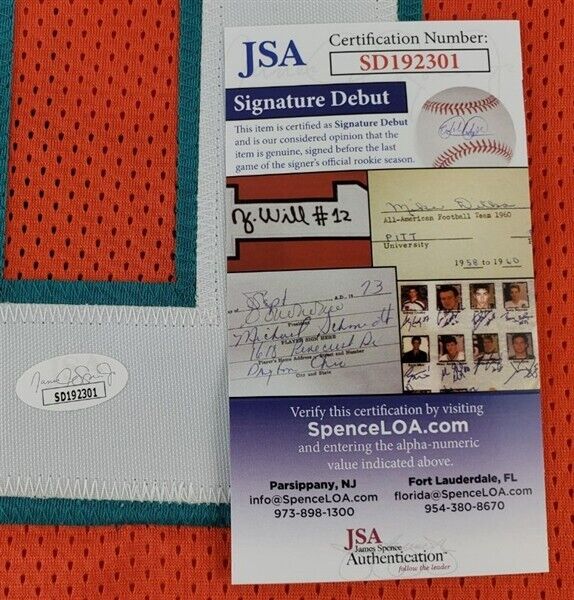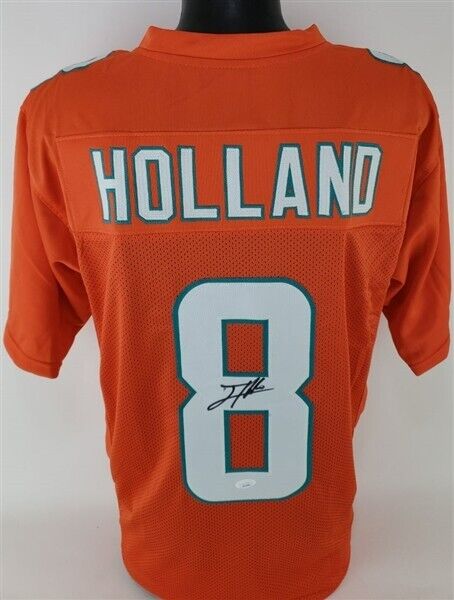 This autographed jersey has been personally hand-signed by Jevon Holland of the Miami Dolphins. This autograph is certified by James Spence Authentication (JSA). It comes with the numbered hologram and matching Certificate of Authenticity.Custom on-field style jerseys are a more affordable option for autograph seekers. These jerseys do not have any brand name or tags and are made in the Philippines. They feature stitched on names and numbers and are made to look very similar to the on-field jerseys that the players wear. These custom jerseys are very commonly used in the memorabilia industry.