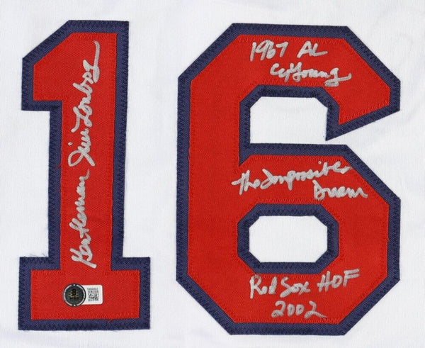 Custom on-field style jersey. Everything sewn on, size XL. Hand-signed and inscribed by Jim Lonborg.The autograph includes an official Beckett Authentication Service (BAS) hologram for authenticity purposes. The signing of this item was witnessed by Beckett.Authentication: Beckett HologramCustom on-field style jerseys are a more affordable option for autograph seekers. These jerseys do not have any brand name or tags and are made in the Philippines. They feature stitched on names and numbers and are made to look very similar to the on-field jerseys that the players wear. These custom jerseys are very commonly used in the memorabilia industry.