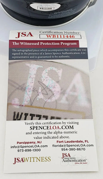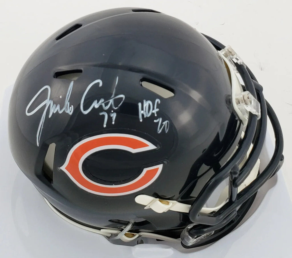 This autographed Riddell speed mini helmet has been personally hand-signed by Jimbo Covert ("HOF 20" inscription) of the Chicago Bears. This autograph is certified by James Spence Authentication's (JSA) Witnessed Protection Program. That means that a JSA representative was present when this item was signed. It comes with the numbered hologram and matching Certificate of Authenticity.