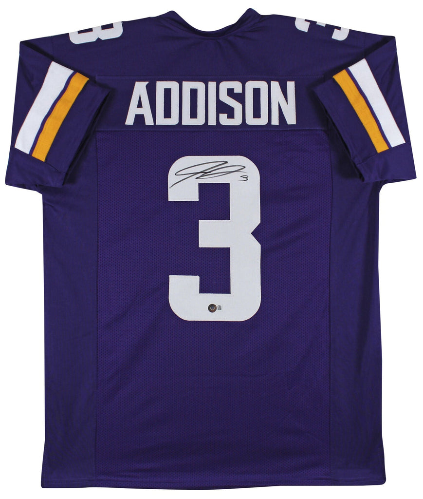 This Autographed Purple Pro Style Jersey has been Personally Signed by Jordan Addison of the Minnesota Vikings. This item is 100% Authentic to include a hologram by Beckett Authentication Services. This item will come with an affixed Beckett Authentication Services (BAS) authentication sticker, which includes a scannable QR code to verify authenticity. Please note that Beckett no longer provides serial-numbered COA cards, and the attached BAS sticker will serve as the complete authentication for this item. This is a BAS Witnessed Protection Program item which means a Beckett Authentication Service representative was present when this item was being signed. We conducted an autograph signing with Jordan Addison where multiples of the same item were signed. While the photographs are representative of this item, the size, placement and strength of the signature may vary. Each item is hand signed, therefore, each autograph is unique. This item can be verified through BAS Witnessed. This is a X-Large sized, non-branded, custom-stitched Jersey.