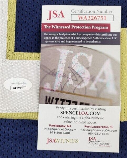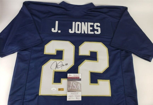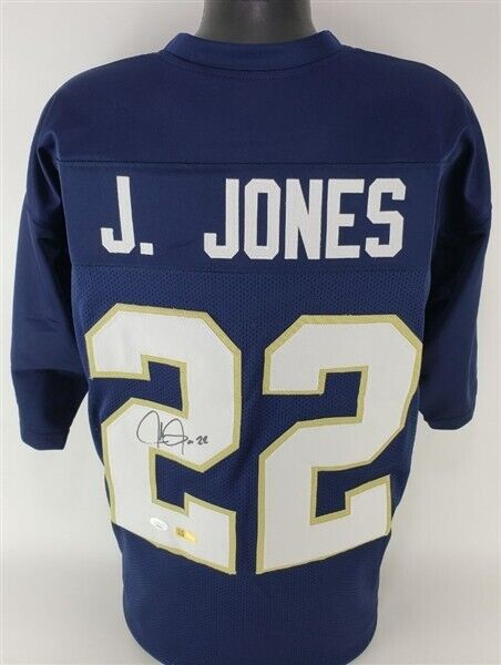 This autographed jersey has been personally hand-signed by Julius Jones of the Notre Dame Fighting Irish. This autograph is certified by James Spence Authentication's (JSA) Witnessed Protection Program. That means that a JSA representative was present when this item was signed. It comes with the numbered hologram and matching Certificate of Authenticity.Custom on-field style jerseys are a more affordable option for autograph seekers. These jerseys do not have any brand name or tags and are made in the Philippines. They feature stitched on names and numbers and are made to look very similar to the on-field jerseys that the players wear. These custom jerseys are very commonly used in the memorabilia industry.