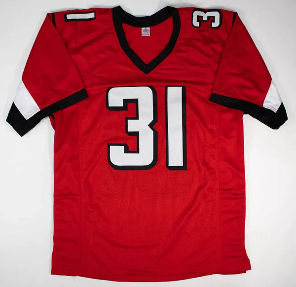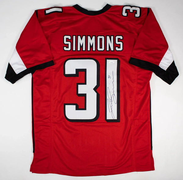Custom on-field style jersey with everything sewn on, size XL. Hand-signed by Justin Simmons.This autograph is certified by James Spence Authentication's (JSA) Witnessed Protection Program. That means that a JSA representative was present when this item was signed. It comes with the numbered hologram and matching Certificate of Authenticity.Custom on-field style jerseys are a more affordable option for autograph seekers. These jerseys do not have any brand name or tags and are made in the Philippines. They feature stitched on names and numbers and are made to look very similar to the on-field jerseys that the players wear. These custom jerseys are very commonly used in the memorabilia industry.