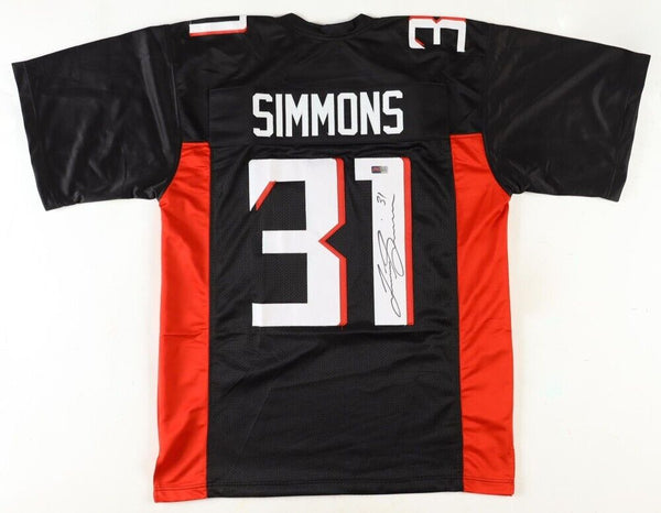 Custom on-field style jersey with everything sewn on, size XL. Hand-signed by Justin Simmons.The lot / autograph(s) includes an official Players Ink Authentication hologram for authenticity purposes.Authentication: PIA HologramCustom on-field style jerseys are a more affordable option for autograph seekers. These jerseys do not have any brand name or tags and are made in the Philippines. They feature stitched on names and numbers and are made to look very similar to the on-field jerseys that the players wear. These custom jerseys are very commonly used in the memorabilia industry.