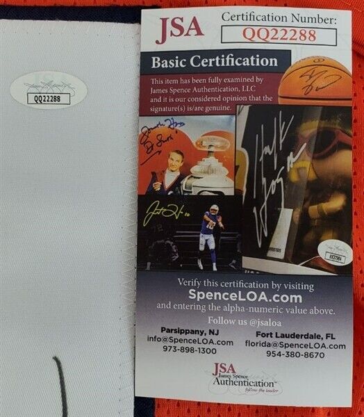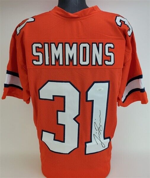 This autographed jersey has been personally hand-signed by Justin Simmons of the Denver Broncos. This autograph is certified by James Spence Authentication (JSA). It comes with the numbered hologram and matching Certificate of Authenticity.Custom on-field style jerseys are a more affordable option for autograph seekers. These jerseys do not have any brand name or tags and are made in the Philippines. They feature stitched on names and numbers and are made to look very similar to the on-field jerseys that the players wear. These custom jerseys are very commonly used in the memorabilia industry.
