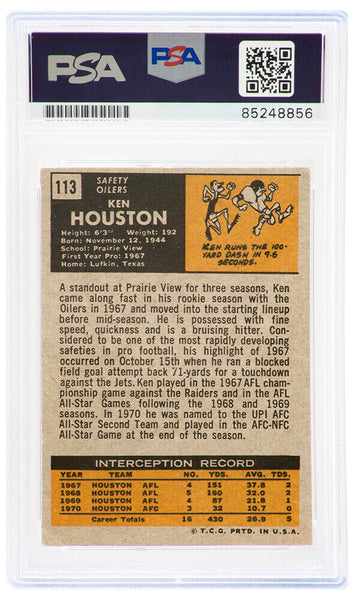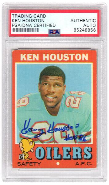 Ken Houston signed Houston Oilers 1971 Topps football rookie trading card #113. The card has been authenticated and encapsulated by PSA/DNA and the number can be verified online.