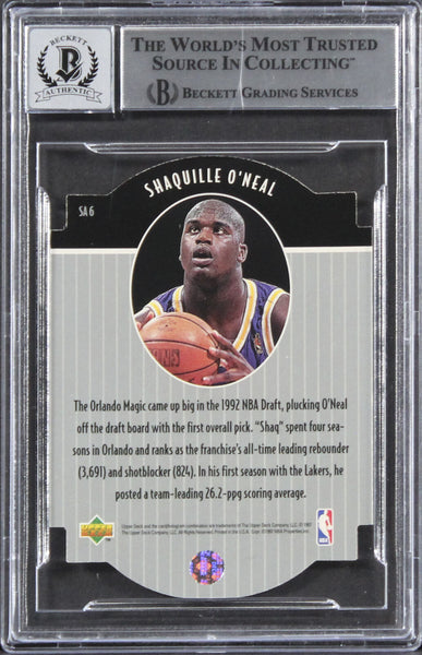 This Autographed Auto Graded Gem Mint 10! 1997 Collector's Choice Star Attractions #SA6 Card has been Personally Signed by Shaquille O'Neal of the Los Angeles Lakers. This item is 100% Authentic, it comes slabbed and authenticated by Beckett Authentication Services. We have multiples of this same item. While the photographs are representative of this item, the size and placement of the signature may vary. Each item is hand signed, therefore, each autograph is unique.