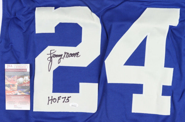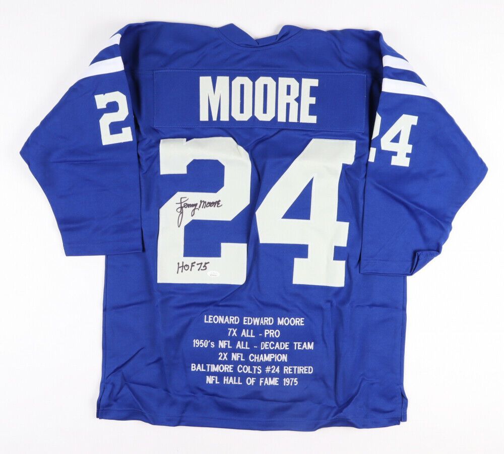 Custom on-field style jersey. Everything sewn on, size XL. Hand-signed and inscribed by Lenny Moore (HOF). Moore's career highlights have been custom stitched onto the back of the jersey below the reverse numbers.The lot / autograph(s) includes an official James Spence Authentication (JSA) hologram and matching COA for authenticity purposes. The signing of this item was witnessed by JSA.Authentication: JSA COA