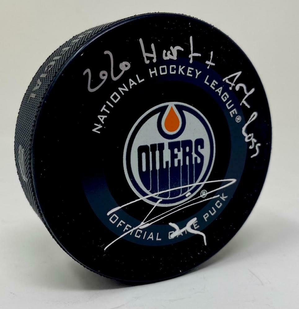 This official NHL Edmonton Oilers puck has been personally hand-signed by Leon Draisaitl with the added inscription "2020 Hart & Art Ross." It is officially licensed by the National Hockey League and comes with an individually numbered, tamper-evident hologram from Fanatics Authentic. To ensure authenticity, the hologram can be reviewed online. This process helps to ensure that the product purchased is authentic and eliminates any possibility of duplication or fraud.Made in the USAFanatics Authentic Presented by Mounted MemoriesIncludes tamper-evident hologram to ensure authenticityOfficially licensed This product is guaranteed authentic and includes a Fanatics Certificate of Authenticity and an accompanying tamper-evident Fanatics Hologram.