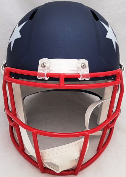 This is a New England Patriots AMP Blue Full Size Replica Speed Helmet that has been hand signed by Mac Jones. This item has been witnessed and certified authentic by Beckett Authentication (BAS) and comes with their tamper-proof witness sticker. Beckett Authentication has recently changed their physical certificate card policy where they no longer match their tamper-proof sticker with a physical certificate. The tamper-proof sticker holds the value in the authentication process while the certificate does not. A certificate can be printed on Beckett's website for the matching authentication number.