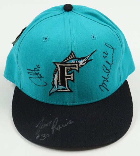 New Era Florida Marlins fitted hat, size 7 1/8. Hand-signed by Tim Raines (HOF), Mike Redmond & Derrek Lee.The lot / autograph(s) includes an official James Spence Authentication (JSA) hologram and matching COA for authenticity purposes.Authentication: JSA COA