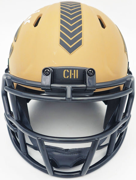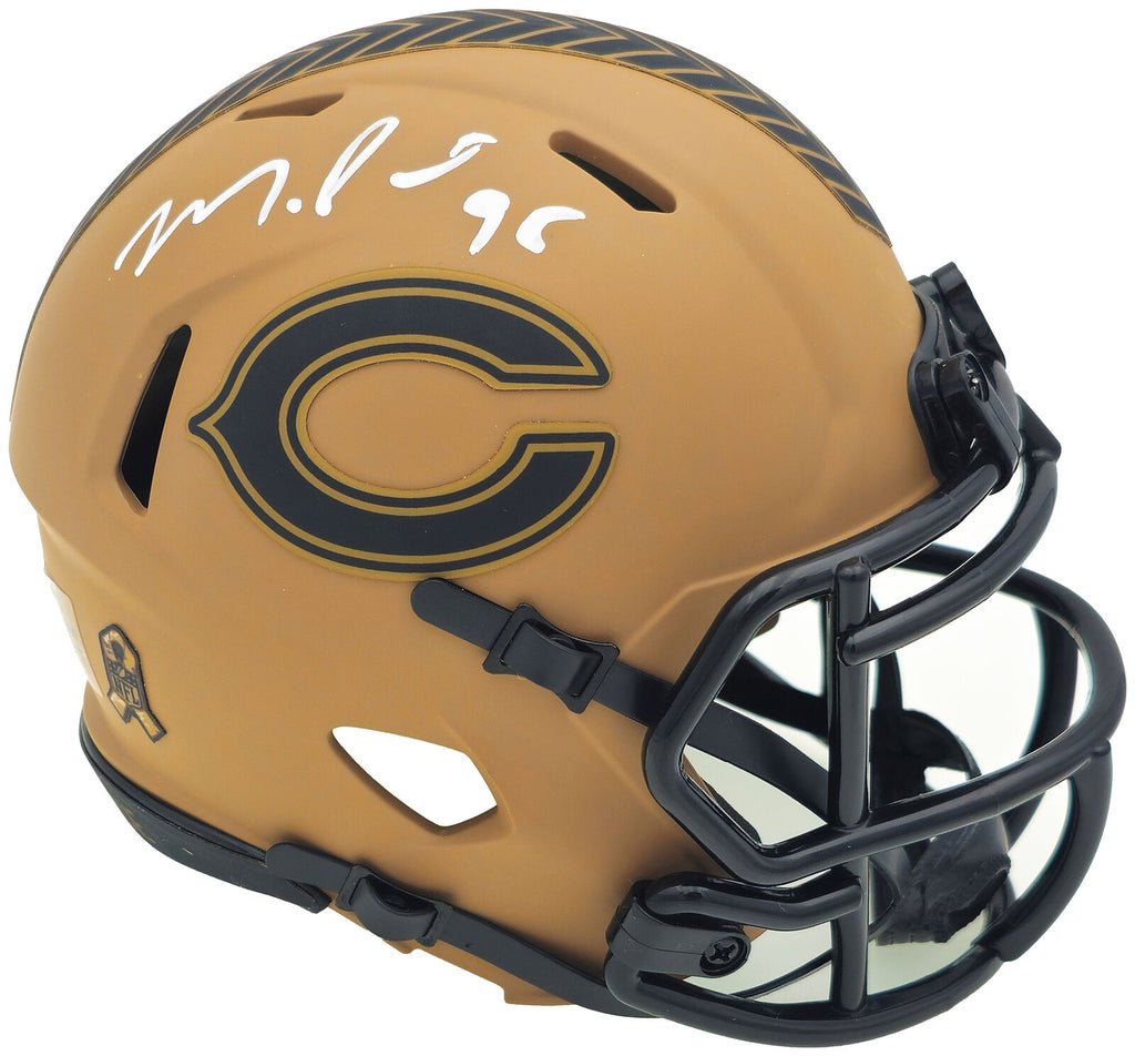 This is a Chicago Bears Camo Brown Salute to Service Speed Mini Helmet that has been hand signed by Montez Sweat. Because each Camo helmet is hand-dipped using water-transfer technology there may be slight imperfections. This item has been certified authentic by JSA and comes with their tamper-proof sticker and matching certificate of authenticity.