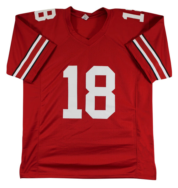 This Autographed Red Pro Style Jersey has been Personally Signed by Will Howard of the Ohio State Buckeyes. This item is 100% Authentic to include a hologram by Beckett Authentication Services. This item will come with an affixed Beckett Authentication Services (BAS) authentication sticker, which includes a scannable QR code to verify authenticity. Please note that Beckett no longer provides serial-numbered COA cards, and the attached BAS sticker will serve as the complete authentication for this item. This is a BAS Witnessed Protection Program item which means a Beckett Authentication Service representative was present when this item was being signed. We conducted an autograph signing with Will Howard where multiples of the same item were signed. While the photographs are representative of this item, the size, placement and strength of the signature may vary. Each item is hand signed, therefore, each autograph is unique. This item can be verified through BAS Witnessed. This is a X-Large sized, non-branded, custom-stitched Jersey.