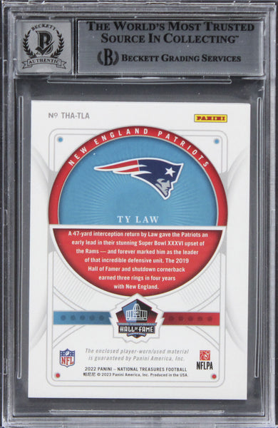 This Autographed Auto 10 2022 National Treasures OF The Hall #27 Card has been Personally Signed by Ty Law of the New England Patriots. This item is 100% Authentic, it comes slabbed and authenticated by Beckett Authentication Services. The authenticity can be verified on Beckett Authentication Services website.
