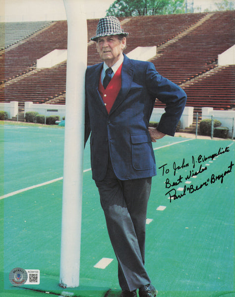 Paul Bear Bryant Autographed 8x10 Photo Alabama "To John" Beckett QR #AC94153