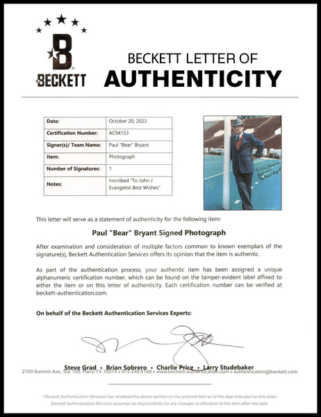 This is an 8x10 Photo that has been hand signed by Paul Bear Bryant. This item was inscribed "To John." This item has been certified authentic by Beckett Authentication (BAS) and comes with their tamper-proof hologram and matching full-page certificate of authenticity.