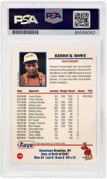 Riddick Bowe signed 1991 Kayo boxing trading card #171. The card has been authenticated and encapsulated by PSA/DNA and the number can be verified online.