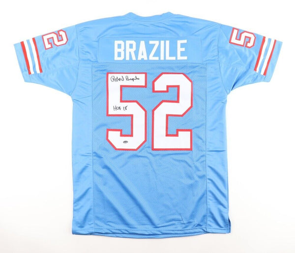 Custom jersey. Everything sewn on, size XL. Hand-signed and inscribed by Robert Brazile (HOF). The autograph(s) includes an official Schwartz Sports Hologram and matching COA for authenticity purposes.Authentication: Schwartz Sports COA