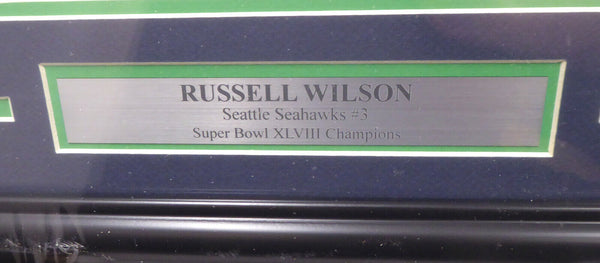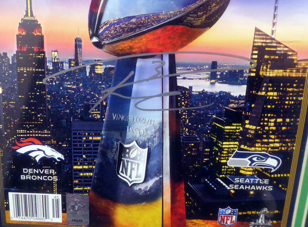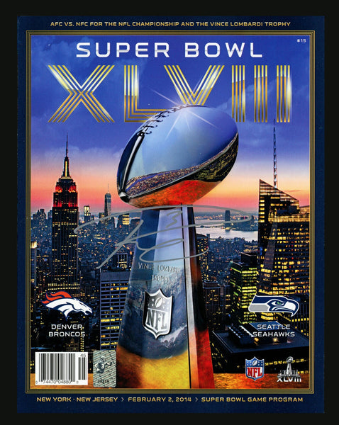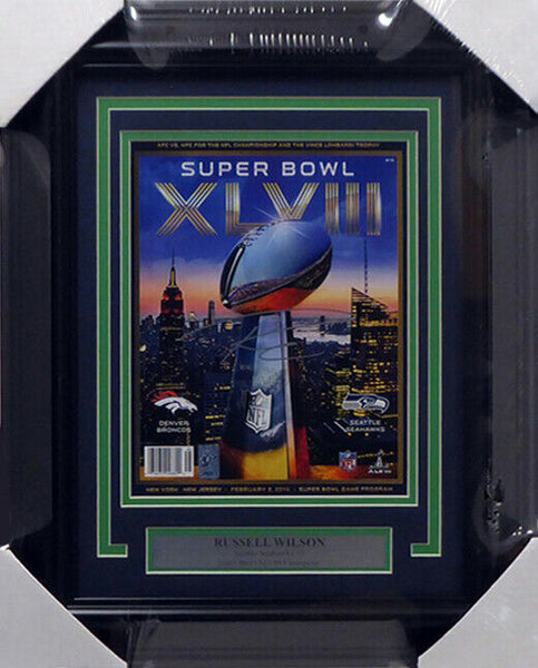 This is a framed Super Bowl XLVIII Program Cover, approximately 16x20 with the frame, A A that has been hand signed by Russell Wilson. It comes with the Russell Wilson hologram & matching certificate of authenticity.