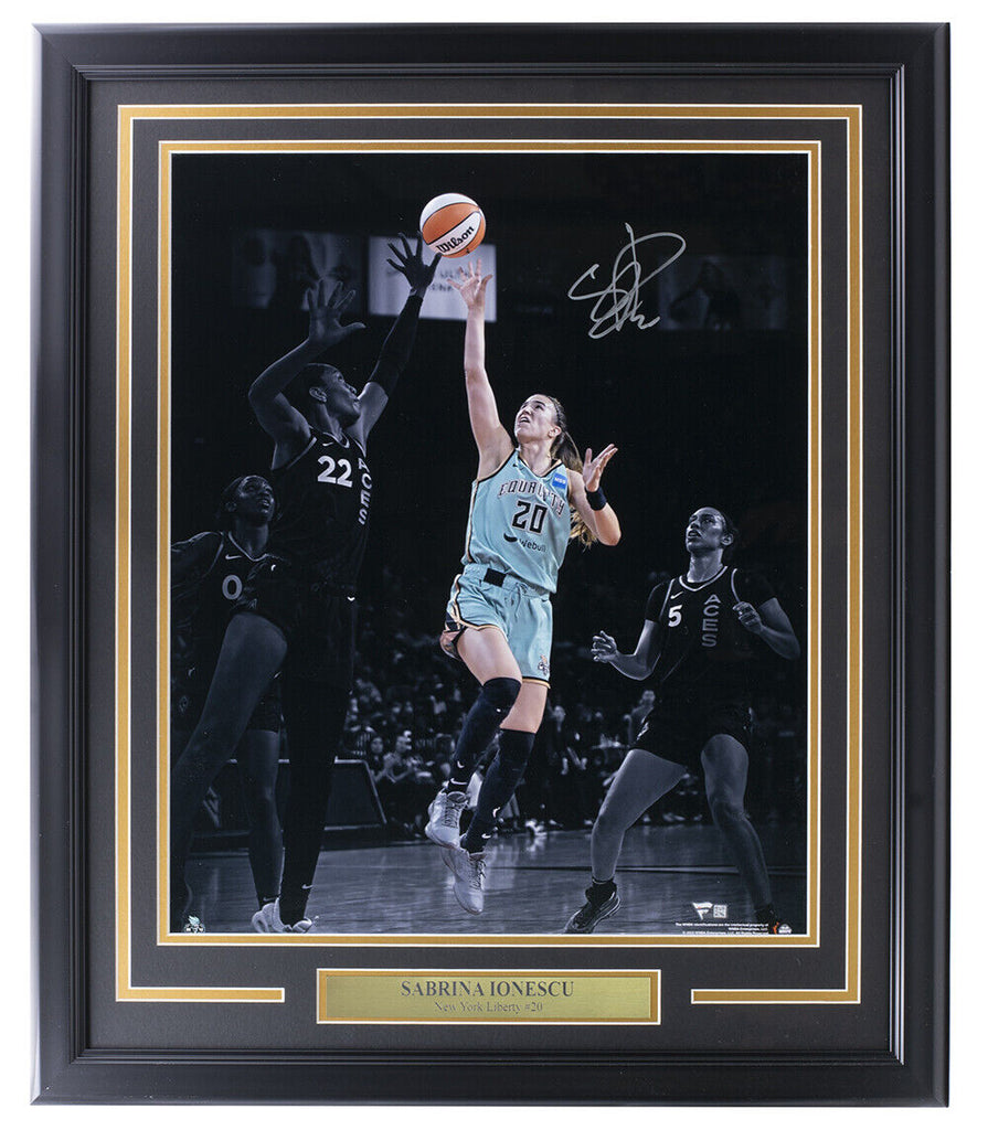 Featured is an Sabrina Ionescu signed framed 16x20 New York Liberty basketball photo. This photo was hand signed by Sabrina Ionescu and has been authenticated by Fanatics authentication services. Included with this photo is a Fanatics hologram and certificate of authenticity. This photo is professionally framed featuring double matting and an engraved nameplate. The frame measures approximately 20x24 in total size, and it is ready for display. This item would make a great addition to any sports memorabilia collection. SPECIFICATIONS Autographed By: Sabrina Ionescu Team: New York Liberty Sport: Basketball-NBA Authentication: Fanatics Authentic