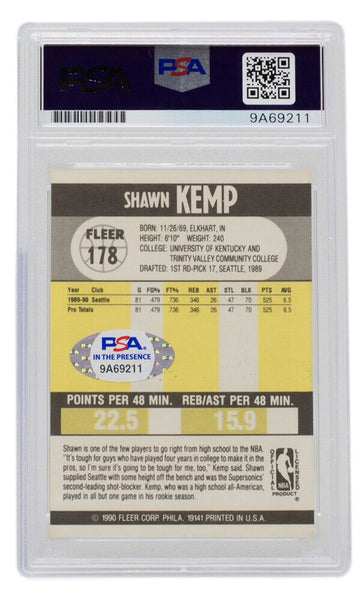 Featured is a Shawn Kemp signed 1990 Fleer #178 Seattle Supersonics basketball card. This card was hand signed by Shawn Kemp in the presence of a PSA authentication representative. This card has also been slabbed and authenticated by PSA authentication services grading the autograph a Gem Mint 10. This item would make a great addition to any sports memorabilia collection! SPECIFICATIONS Autographed By: Shawn Kemp Team: Seattle Supersonics Sport: Basketball Authentication: Professional Sports Authenticator (PSA)