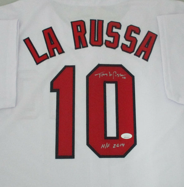 A custom replica hand signed jersey of St Louis Cardinals Hall of Famer TONY LARUSSA. The signature is in Silver paint pen and includes the inscription "HOF 14". This item was signed at a PUBLIC signing with us. This would make a great addition to any CARDINALS collection! his item is guaranteed to be 100% authentic and will include a COA from JSA authentication.