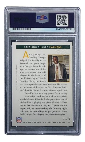 Featured is a Sterling Sharpe Green Bay Packers signed 1992 Pro Line Profiles Trading Card. This card has been hand signed by Sharpe and has been authenticated and encapsulated by PSA, receiving an autograph grade of Gem MT 10. This card would make a great addition to any sports memorabilia collection! SPECIFICATIONS Autographed By: Sterling Sharpe Team: Sport: Football Authentication: Professional Sports Authenticator (PSA)