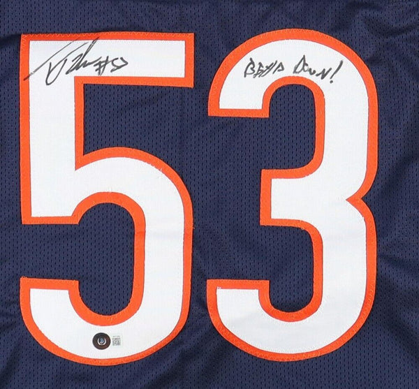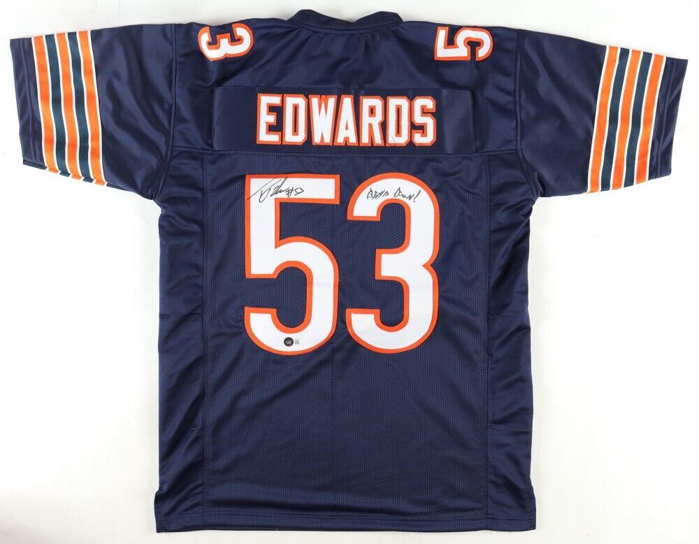 Custom on-field style jersey. Everything is sewn on, size adult XL. Hand-signed and inscribed by T. J. Edwards.The lot / autograph(s) includes an official Beckett Authentication Services serially numbered hologram for authenticity purposes. The signing of this item was witnessed by Beckett.Authentication: Beckett Hologram