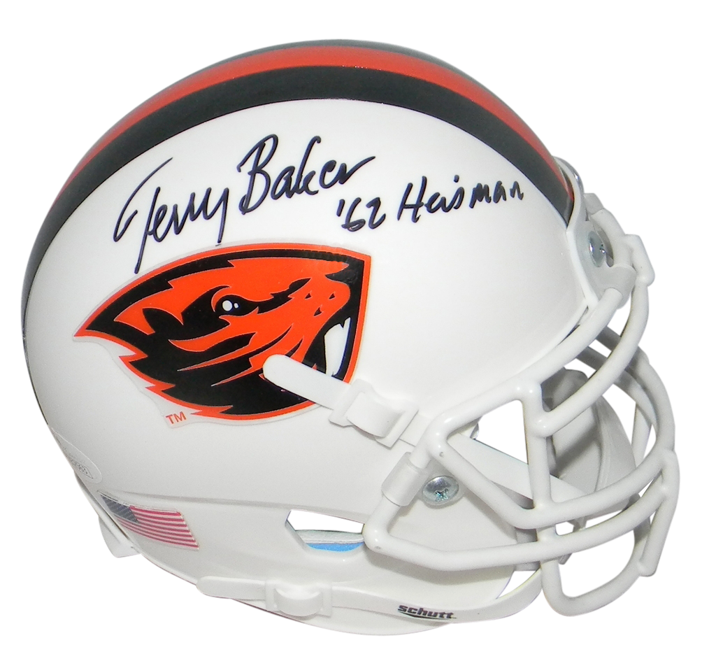 Terry Baker, former Heisman Trophy winning quarterback for the Beavers, has hand signed this Oregon State Schutt mini helmet at a private signing. He included the inscription "62 Heisman" with his signature. This item comes with a certificate of authenticity (COA) from JSA - James Spence Authentication and was signed in the presence of one of their representatives. You will receive a serial-numbered COA along with a matching serial-numbered sticker on the helmet. The authenticity can be verified online by entering the serial number.Item pictured may not be the exact item you will receive. It will be similar quality, and we guarantee your satisfaction.