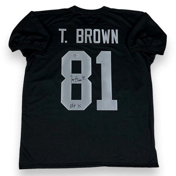 This signed item is brand new without tags or logos. This jersey is a size Large / XL. Pro tackle twill letters and numbers. This item will make a great gift or a great addition to any collection at an AFFORDABLE PRICE! ATHLETE: Tim Brown ITEM: Custom Jersey AUTHENTICATION: This item comes with a Beckett serial #'ed hologram affixed to the item. To ensure authenticity, the hologram can be reviewed online. This process helps to ensure that the product purchased is authentic and eliminates any possibility of duplication or fraud. NOTE: All of our autographed jerseys are custom jerseys, unless otherwise noted. Our custom jerseys are NON-BRANDED, have NO logos, NO tags, NO patches, NO emblems. Pro tackle twill letters and numbers. The non-branded jerseys are made specifically for the player(s) to sign, for collectible purposes.