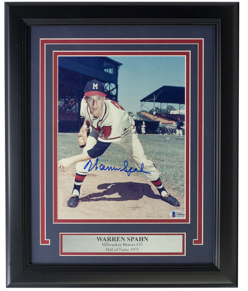Featured is a Warren Spahn signed framed 8x10 Milwaukee Braves photo. This photo was hand signed by Warren Spahn and has been authenticated by Beckett authentication services. Included with the photo is a Beckett hologram and certificate of authenticity. Professionally framed and matted. Measures approximately 11x14 inches in total size, ready for display. SPECIFICATIONS Autographed By: Warren Spahn Team: Milwaukee Braves Sport: Baseball-MLB Authentication: Beckett Grading Services