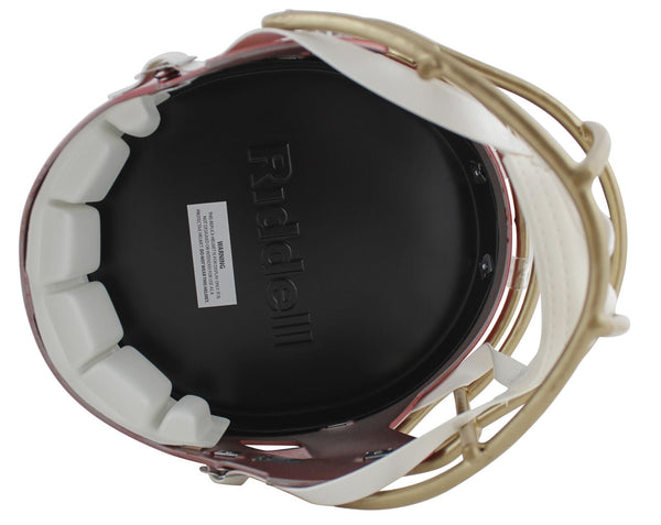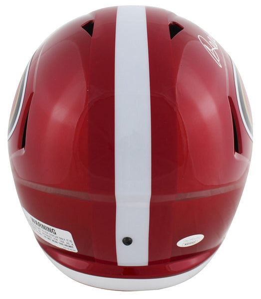 This Autographed Alternate Flash Riddell Full Size Speed Rep Helmet has been Personally Signed by Deebo Samuel of the San Francisco 49ers. This item is 100% Authentic to include a Certificate of Authenticity (COA) / hologram by JSA Witness. This is a JSA Witnessed Protection Program item which means a JSA representative was present when this item was being signed. We conducted an autograph signing with Deebo Samuel where multiples of the same item were signed. While the photographs are representative of this item, the size, placement and strength of the signature may vary. Each item is hand signed, therefore, each autograph is unique. This item can be verified through JSA Witness.