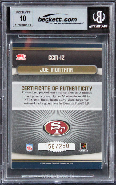 This Autographed Auto Graded Gem Mint 10! 2006 Donruss Threads Century Collection Materials #12 Card has been Personally Signed by Joe Montana of the San Francisco 49ers. This item is 100% Authentic, it comes slabbed and authenticated by Beckett Authentication Services. The authenticity can be verified on Beckett Authentication Services website.