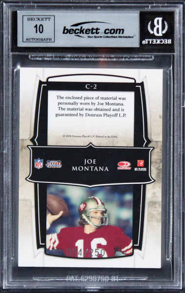 This Autographed Auto Graded Gem Mint 10! 2008 Donruss Sports Legends Champions Materials #2 Card has been Personally Signed by Joe Montana of the San Francisco 49ers. This item is 100% Authentic, it comes slabbed and authenticated by Beckett Authentication Services. The authenticity can be verified on Beckett Authentication Services website.