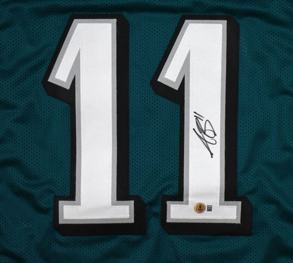 THIS IS NOT AN NFL JERSEY. THIS HAS NO TAGS, NO LOGOS, NO EMBLEMS. This is a hand autograph of AJ Brown of the Philadelphia Eagles on a Custom Made (non name brand) Authentic Style Jersey with stitched letters and numbers. This item has a Beckett Witnessed Authentication, which comes with a Beckett numbered sticker hologram and a QR Code for verification. You can view this item on the Beckett Authentication website. It was signed either at a public autograph appearance or a private signing. This is a stock photo of the item. Although you may not receive this exact item, the item you receive is virtually identical and brand new in great shape. Jersey size is XL. THIS IS NOT AN NFL JERSEY. THIS HAS NO TAGS, NO LOGOS, NO EMBLEMS. This is a hand autograph of AJ Brown of the Philadelphia Eagles on a Custom Made (non name brand) Authentic Style Jersey with stitched letters and numbers. This item has a Beckett Witnessed Authentication, which comes with a Beckett numbered sticker hologram and a QR Code for verification. You can view this item on the Beckett Authentication website. It was signed either at a public autograph appearance or a private signing. This is a stock photo of the item. Although you may not receive this exact item, the item you receive is virtually identical and brand new in great shape. Jersey size is XL.
