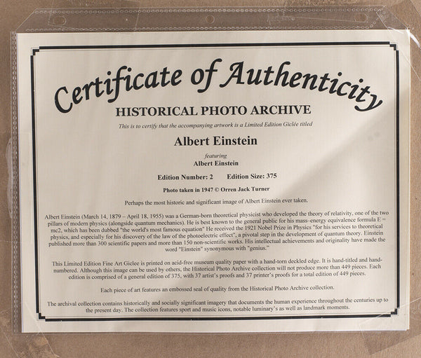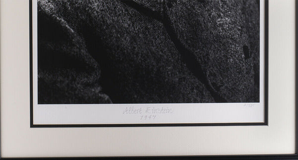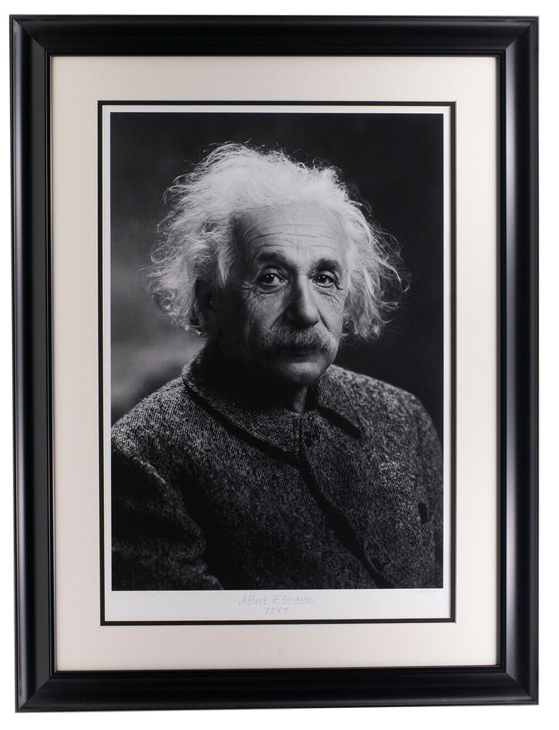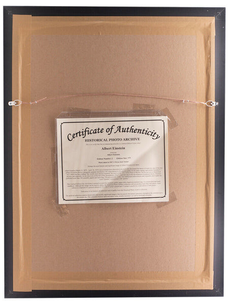 Albert Einstein (14 March 1879 18 April 1955) was a German-born theoretical physicist who developed the theory of relativity, one of the two pillars of modern physics (alongside quantum mechanics). He is best known to the general public for his massenergy equivalence formula E = mc2, which has been dubbed "the world's most famous equation" He received the 1921 Nobel Prize in Physics "for his services to theoretical physics, and especially for his discovery of the law of the photoelectric effect", a pivotal step in the development of quantum theory. Einstein published more than 300 scientific papers and more than 150 non-scientific works. His intellectual achievements and originality have made the word "Einstein" synonymous with "genius" This Limited Edition Fine Art Giclee is printed on acid-free museum quality paper with a hand-torn deckled edge. It is hand-titled, hand-numbered. Edition size is limited to 375 pieces. Measures approximately 16" x 22.5" in size. This giclee has been professionally framed and matted and is approximately 22x27. This giclee comes with an official Historical Photo Archive letter. Product Details BrandSports IntegrityManufacturerSports IntegrityProduct TypeEntertainment/Unsigned MemorabiliaMpn33157