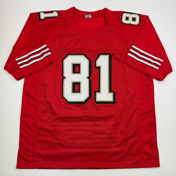 Autographed/Signed Terrell Owens San Francisco Red Stat Football Jersey JSA COA Jersey has no brand names or logos. This is a custom jersey and was not manufactured by or in any manner associated with any professional sports league or manufacturer. This custom jersey carries no professional sports league designation. The item is intended to be an autographed collectible. The custom jersey displays the name and number of the player. This item in no way is affiliated with or connected to any professional sports organization. Size is XL.