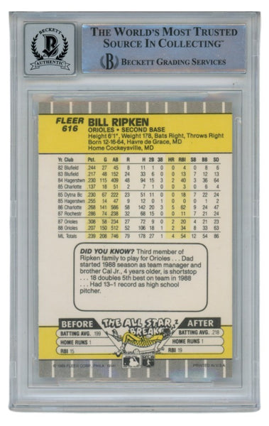 The number in the listing title is just an inventory sku for our records and is not the authentication number. The item pictured is the exact image you will receive, please see photos for condition. This is a Baltimore Orioles 1989 Fleer #616 Black Box Variation Slabbed Trading Card that was personally autographed by Billy Ripken. Includes a certificate of authenticity from Beckett Authentication Services (BAS) and Denver Autographs. FREE SHIPPING within the USA on orders over $10!