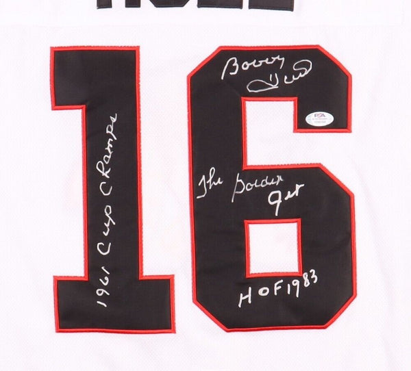 CCM on-ice style jersey. Everything is sewn on, size 52. Hand-signed and inscribed by Bobby Hull (Chicago Blackhawks, HOF).The lot / autograph(s) includes an official PSA/DNA hologram and matching COA for authenticity purposes. The signing of this item was witnessed by PSA.Authentication: PSA COA