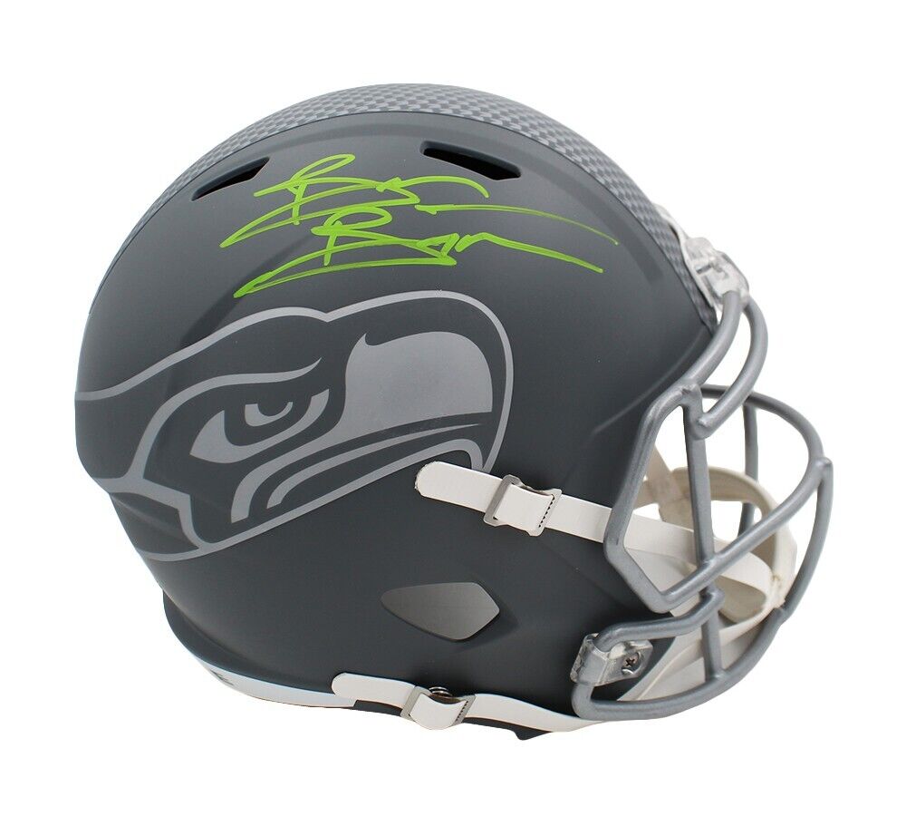 A Seattle Seahawks Speed Replica Slate NFL Helmet hand signed by Brian Bosworth. The item and signature are in excellent condition. Brian is a former NFL linebacker. He was picked 1st round in the 1987 NFL Draft by the Seattle Seahawks. He played in college for the University of Oklahoma. 2x Unanimous All-American, 1985 National Champion. AUTHENTICATION: Your item has been tagged with a SmarTag powered by Prova Technology, which gives you digital access to your items authentication records, including a proof picture from the signing.