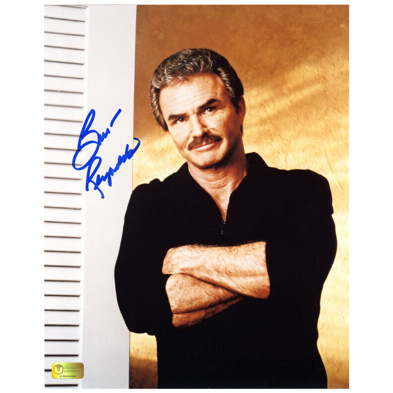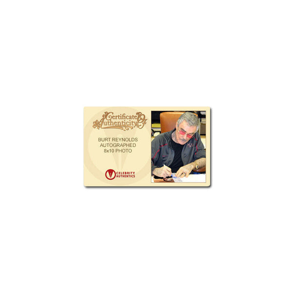 This 8x10 portrait photo of the late film legend Burt Reynolds has been personally hand-signed by Burt Reynolds during his autograph signing with Celebrity Authentics. Item ships affixed with the Celebrity Authentics serial-numbered and tamper evident Authentication Hologram and includes Celebrity Authentics Certificate of Authenticity featuring picture of Burt signing photo. Please note: with multiples signed by the actor, a sample photo is used from stock to represent what you will receive. Exact autograph size and placement may vary.