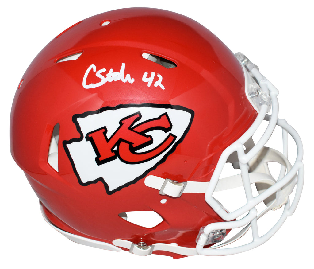 Carson Steele, star running back for the Kansas City Chiefs, has hand signed this Chiefs Riddell Speed full-size authentic helmet at a private signing. This helmet is fully padded inside like the ones worn on the field. This item is authenticated by Beckett Authentication Services and was signed in the presence of one of their representatives. Their tamper-evident hologram featuring a QR code and serial number is on the item. The authenticity can be verified online by entering the serial number or scanning the QR code.Item pictured may not be the exact item you will receive. It will be similar quality, and we guarantee your satisfaction.
