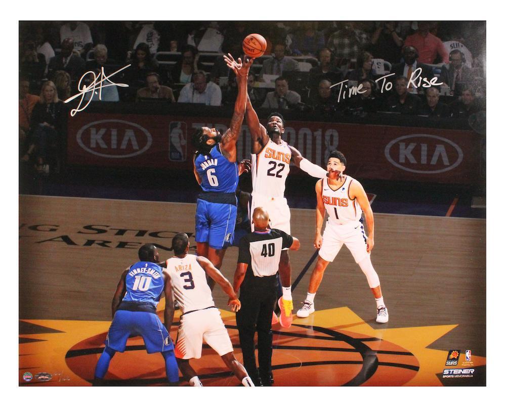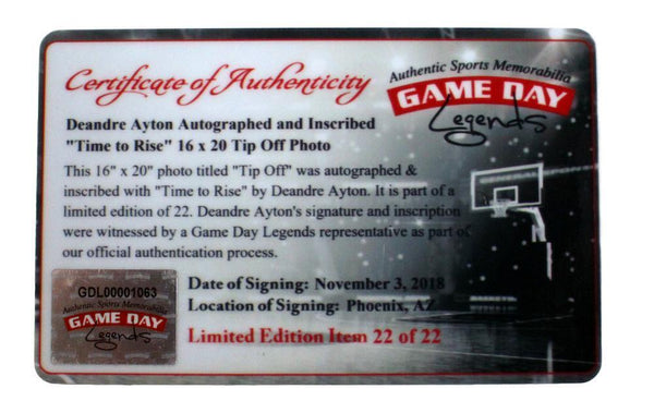 This photograph was autographed by Deandre Ayton with the inscription "Time To Rise." It is officially licensed by the National Basketball Association and comes with an individually numbered, tamper-evident hologram from Super Sports Center Authenticated as well as Steiner Sports Authentic. Your signed item can be identified and verified for authenticity by entering the serial number from your hologram into our online database. This process confirms and guarantees that your collectible is authentic and eliminates all possibility of duplication and fraud.This product is guaranteed authentic and includes a Super Sports Center Certificate of Authenticity and an accompanying tamper-evident hologram.
