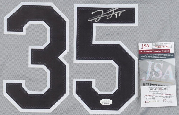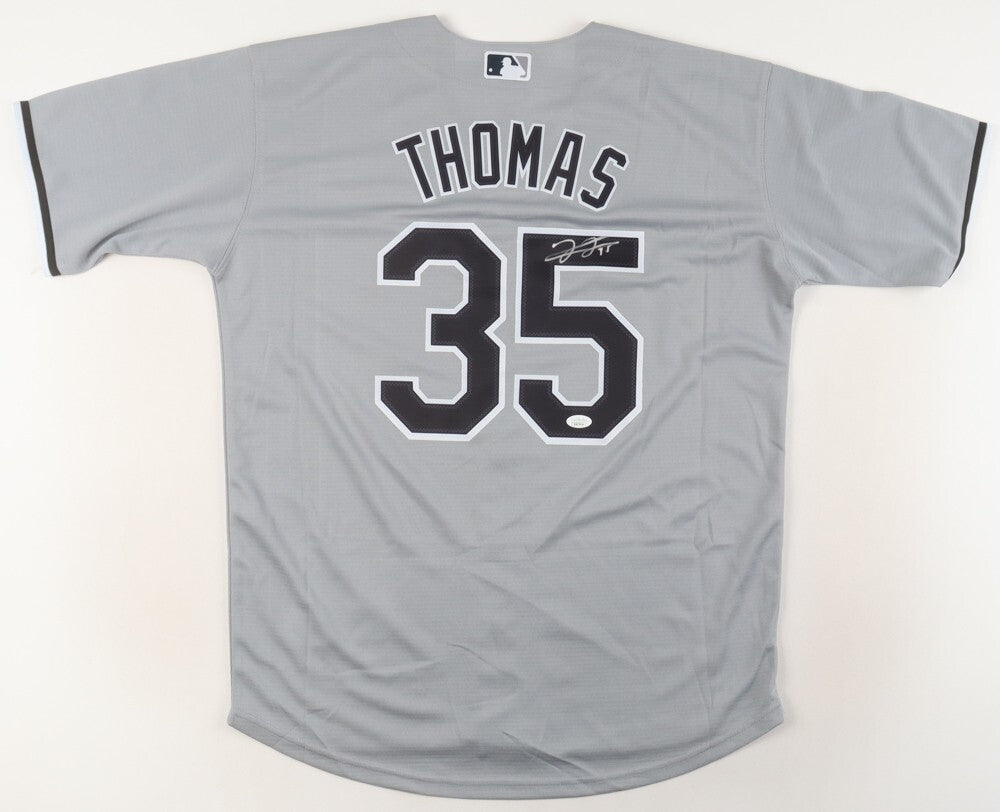 Nike style replica jersey with everything sewn on, size adult Large. Hand-signed by Frank Thomas (HOF).The autograph(s) includes an official James Spence Authentication (JSA) hologram and matching COA for authenticity purposes. The signing of this item was witnessed by JSA.Authentication: JSA COA