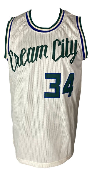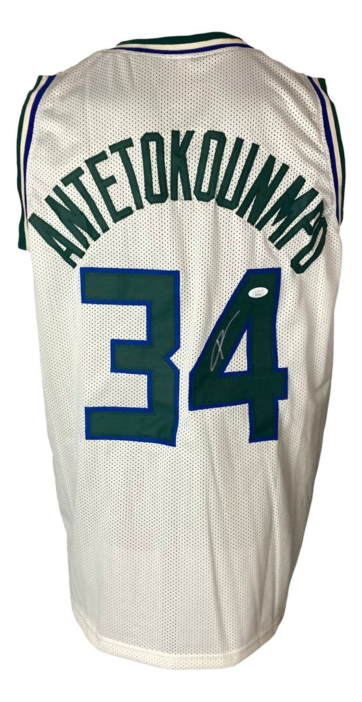 Featured is a Giannis Antetokounmpo signed custom basketball jersey. This jersey has been hand signed by Antetokounmpo and comes with the JSA hologram and certificate of authenticity. This jersey features professionally sewn letters and numbers and is size XL. This jersey has no team tags or emblems and is intended as a sports collectible. This jersey would make a great addition to any sports memorabilia collection! SPECIFICATIONS Autographed By: Giannis Antetokounmpo Team: Milwaukee Bucks Sport: Basketball Authentication: James Spence Authentication (JSA)